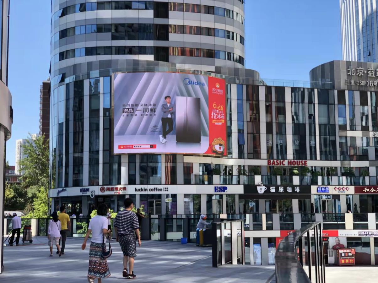 樓頂展示面為東、西向,畫面同步播放。樓體幅寬80米,高150米,為三里屯地區第一高樓。最大程度影響工體北路、二環、三環、三里屯商圈人群。