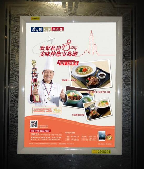 電梯框架廣告是指電梯轎廂內的廣告框,一般用來安裝廣告海報,起到廣告作用。電梯廣告框架是生活中最常見的電梯廣告類型,也最為普遍的類型,通常在商場、小區電梯內是常常可以看見的一種廣告方式。在投放此類廣告商一定要在海報設計上富有創意,采用多圖少字的設計,信息量充足,這樣才能達到傳播的效果。
