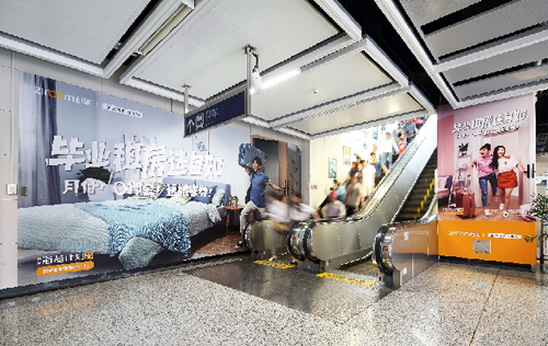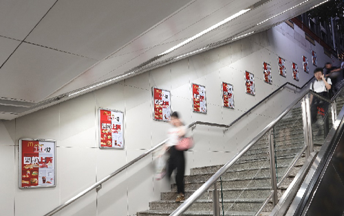 | 創意媒體-南京地鐵新街口站14號品牌通道廣告 線路:1、2號線 組合形式:130㎡梯側貼 媒體費(元/52周):380,000 制作方式:寫真噴繪 制作費(元/次):39,000 |
