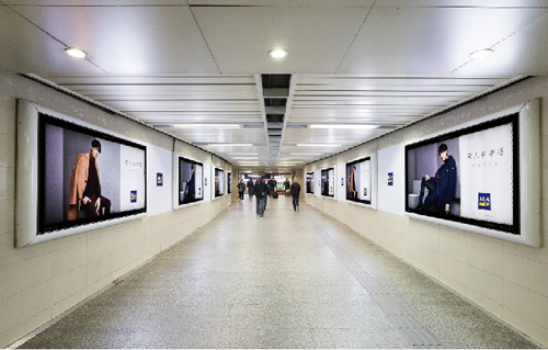| 電子媒體-南京地鐵大行宮站動感長廊廣告 組合形式:A(近2號出入口):3組(6塊)雙聯65寸高清液晶顯示屏 +58.61㎡頂天立地墻貼+12封燈箱20套裝 B(近3號出入口):3組(6塊)雙聯65寸高清液晶顯示屏 +68.8㎡頂天立地墻貼+12封燈箱20套裝 媒體費(元/52周):400,000 制作方式:UV寫真燈片+寫真噴繪+電子動畫 制作費(元/次):39,083(墻貼+燈片)、42,140(墻貼+燈片) |