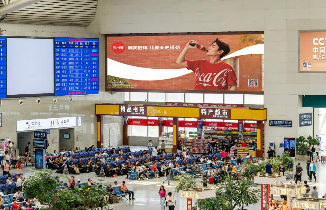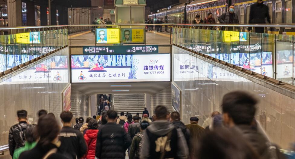 | 出發(fā)層候車大廳巨型墻面燈箱 · 4塊? 媒體尺寸(寬x高x面):109.2㎡ (19.5m×5.6m×1面) 投放形式:1塊/組 媒體價值: 1、此媒體為候車區(qū)南北對稱墻體上方媒體,中間無任何遮擋,百余平方米巨型畫面,視覺震撼性強,且候車室內無死角,彰顯品牌形象。 2.巨幅燈箱廣告畫面投放到達率高,受眾對于品牌畫面的視讀性好,對于品牌的記憶度高。 |