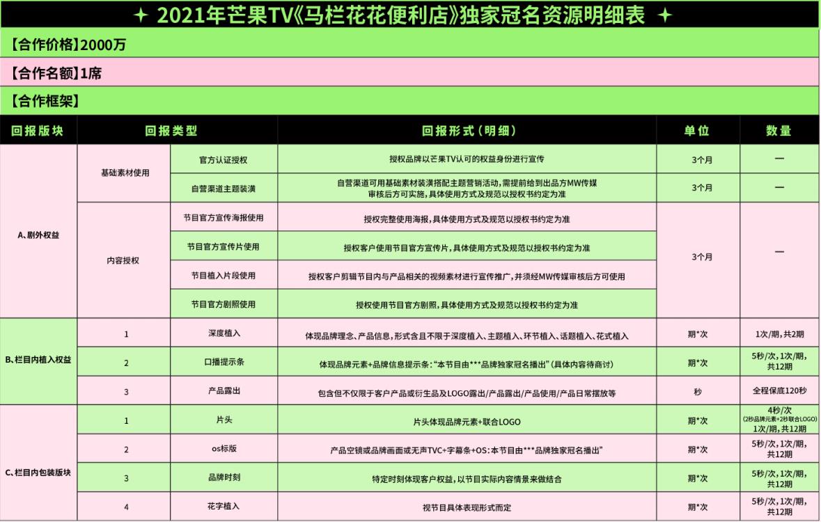 2021年芒果TV《馬欄花花便利店》獨家冠名資源明細表