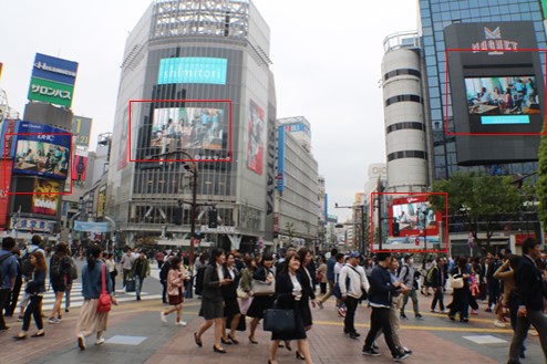 • Media size: Shibuhachi Hit Vision: H17,300mm x W24,300mm Shibuya Eki-mae Vision: H16,320mm x W21,600mm Mighty Vision Shibuya: H5,600mm x W9,920mm Q eyes Main Screen: H7,280mm x W12,950mm ,Sub Screen: H5,320mm