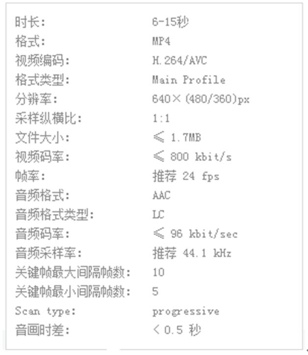 | 1、外層圖--圖片規(guī)格 此圖會(huì)同步作為朋友圈外層圖 文字占圖篇幅不超過30% 圖片格式:大小不超過300KB,不支持GIF格式 圖片尺寸:800*800像素/640*800像素/800*640像素 朋友圈展現(xiàn)形式及要求網(wǎng)址: https://ad.weixin.qq.com/landing-page-guide.html#/376 2、輪播圖--圖片規(guī)格 在投放廣告時(shí),此圖會(huì)同步作為朋友圈外層圖 圖片格式:大小不超過300KB,不支持GIF格式 文字占比:不超過30% 圖片尺寸:800*800像素、640*960像素、640*1130像素 朋友圈形式及要求: https://ad.weixin.qq.com/landing-page-guide.html#/377 3、視頻--視頻規(guī)格 在投放廣告時(shí),視頻會(huì)同步作為朋友圈外層視頻 視頻自動(dòng)循環(huán)播放 視頻尺寸:640*480/640*360像素 視頻大小:文件大小不超過1.7MB 視頻長(zhǎng)度:6-15秒 ? |