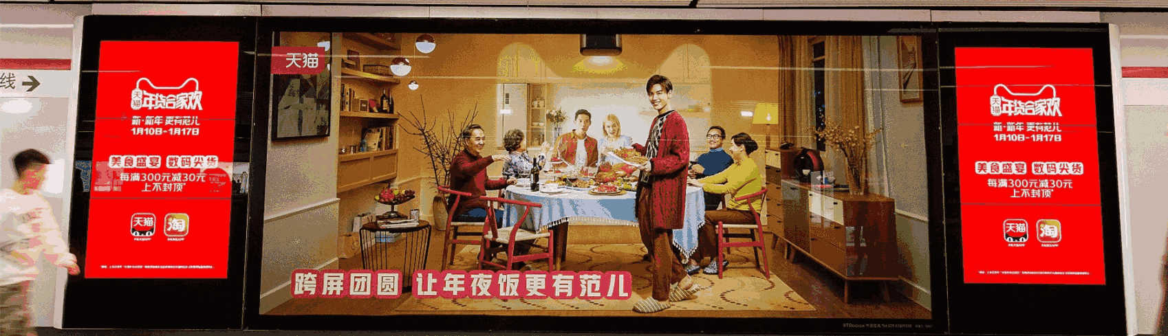 由 電子屏 與 超級動感燈箱,相互交錯組成的電子媒體通道,大面積的靜態海報與高精度的動態畫面不斷沖擊乘客視覺;頂部天花板與通道內柱體的鏡面環境設計從空間上帶來沉浸式的3D體驗;每個區域的定向音響環繞聲系統 從聽覺上刺激乘客的感官體驗 ,日均客流達55萬*人次 支持動畫、TVC、電子海報等,可制作各種大型創意效果