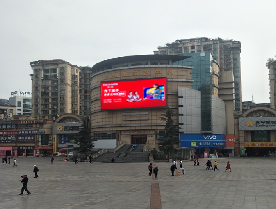 媒體價值: 此廣告位位于達州市通川區中心廣場演藝中心樓面,中心廣場涵蓋蘇寧易購以及眾多年輕潮牌匯集于此,是購物、休閑、金融、娛樂的中心地帶。
