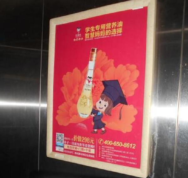 電梯框架廣告,也就是我們常說的電梯海報(bào)廣告,是一種靜態(tài)畫面廣告形式。廣告位置在電梯轎廂內(nèi)側(cè)或電梯等候廳墻壁上,畫面尺寸為420*570mm,投放成本比較少,同時(shí)又是所有居住人群的必經(jīng)之地,所以電梯框架是電梯廣告中投放最多的廣告形式。
