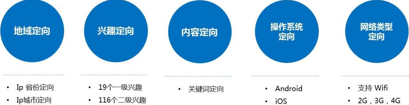 目前開(kāi)放上線4個(gè)維度定向,分別是地域定向、興趣定向、內(nèi)容定向、操作系統(tǒng)定向、網(wǎng)絡(luò)類型定向,
