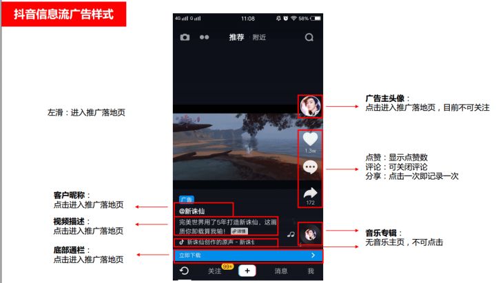 出現在抖音APP推薦頻道上滑第四位,廣告時長為5s-30s,每個用戶每天最多看1條廣告;每條廣告對每個用戶只展示1次,同一素材最多只能投放1天,不支持各種形式的同一素材重復投放。