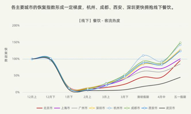 注意,數據周期是從去年12月-今年5月,以去年12月初的平均水平作為疫情前基準值,不同時間節點除以基準值得出的比值,大于100%表示超過疫情前平均水平,小于100%則表示尚未恢復至原先狀態。同時,該報告取樣關注了北京、上海、廣州、深圳、武漢、杭州、成都、西安8個主要城市,聚焦吃住行購、平安喜樂等熱門線下場景。