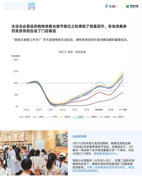 人們在添置生活物資之余,生活非必需品的購買熱情也得到明顯回升,線下購買力正在加速回歸。同時,疫情使人們意識到私家車的重要性,帶動汽車銷售快速回暖,到了3月下旬,除北京、武漢外,其他城市均基本恢復至疫情前水準,清明假期各地4S店客流熱度穩步回升,五一假期更是迎來客流爆滿。