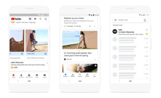 Discovery Ads將會(huì)在YouTube主頁(yè)、“Watch Next”、谷歌搜索APP中的“Discovery”以及Gmail推廣和社交的Tab中展示,有多圖輪播廣告和單圖廣告兩種形式。三個(gè)平臺(tái)覆蓋了29億用戶。