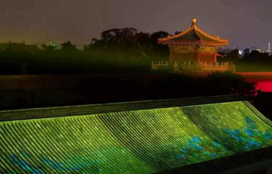 此次夜游故宮最精彩的地方,莫過于從東北角樓帶神武門的這一塊區(qū)域了。光與影將《清明上河圖》和《千里江山圖》等畫卷投影于大殿屋頂上,或如展開的折扇,或如綠色的屏障,耳邊還應(yīng)景地回蕩著叫賣、搖櫓等聲音,古畫的意境與屋瓦融為一體,靈動(dòng)異常,仿佛人在畫中游。