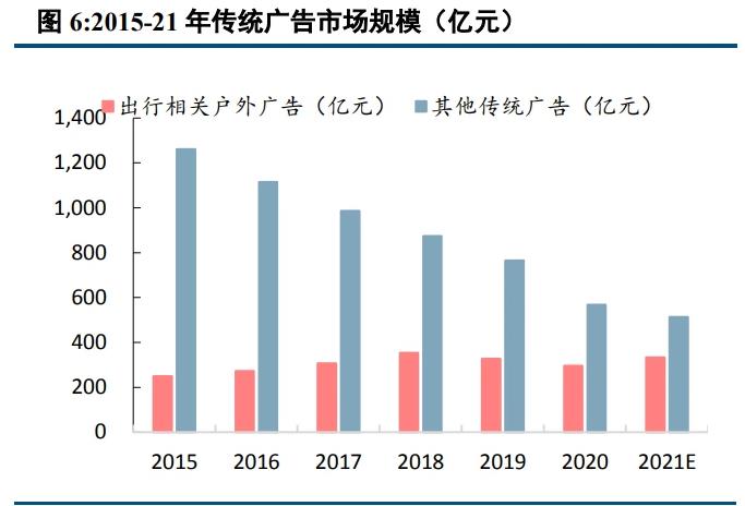 線下廣告市場規(guī)模有所回落,但結(jié)構(gòu)性機(jī)會仍存。2013-20 年全國傳統(tǒng)廣告規(guī)模自 1762 億元下降至 864 億 元,降幅為 52.7%;相較而言,網(wǎng)絡(luò)廣告自 1105 億元增長至 7666 億元,增幅 593.8%。傳統(tǒng)廣告規(guī)模的流失主 要是用戶注意力向移動媒介轉(zhuǎn)移,表現(xiàn)為用戶上網(wǎng)時長占比提升,而其他活動的時長占比相對下降。但居民時 間結(jié)構(gòu)上,出行相關(guān)時長占比提升,出行圈廣告可能存在結(jié)構(gòu)性機(jī)會。