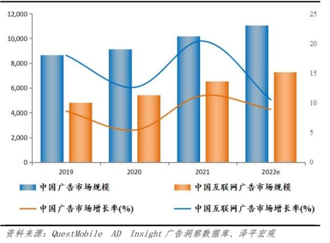 目前,根據QuestMobile統(tǒng)計數據顯示,2021年中國廣告市場規(guī)模超過萬億,同比增速超過11%,互聯(lián)網廣告市場規(guī)模超過6500億,同比增速超過20%。預計2022年中國廣告市場規(guī)模為11069億元,同比增速10.5%,互聯(lián)網廣告市場規(guī)模為7237.9億元,同比增速8.9%。這意味著我國傳媒業(yè)市場發(fā)生了本質性變化,互聯(lián)網媒體成為真正的主導,而傳統(tǒng)媒體逐漸式微,中國傳媒市場發(fā)生了根本性的改變。