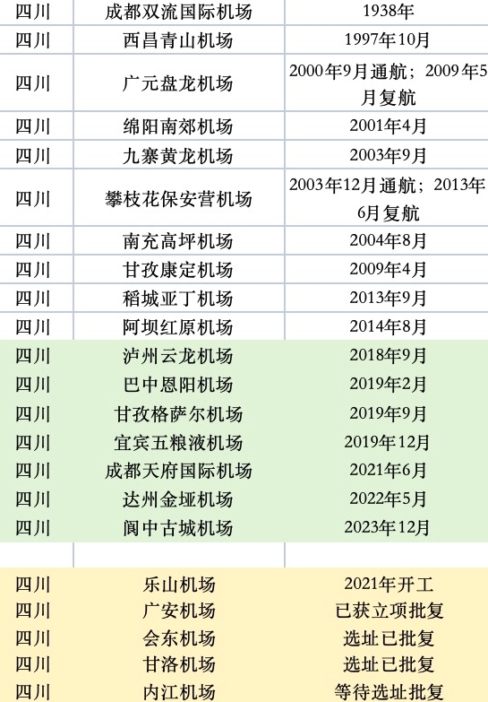 2018年以來,四川已建成7個民用機場,分別為瀘州云龍機場、巴中恩陽機場、甘孜格薩爾機場、宜賓五糧液機場、成都天府國際機場、達(dá)州金埡機場、閬中古城機場,平均一年建成超過一個。