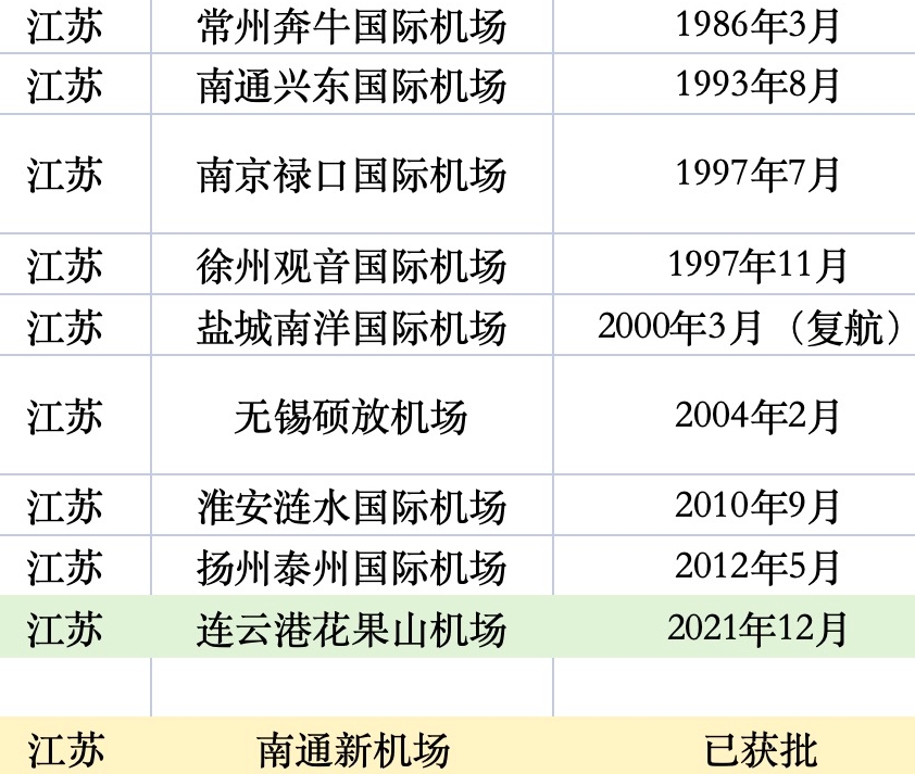 江蘇已有和在建的民用運輸機場(制表:時代周報記者 王晨婷)